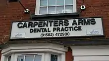 Signage for the Carpenters Arms Dental Practice, Dunstable, Bedfordshire, housed in the premises of a former public house.