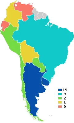 Map of CONMEBOL members, by their Copa América title number (as of 2021)