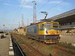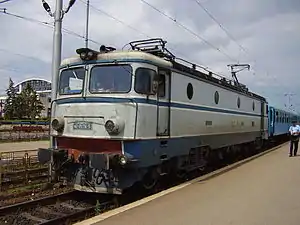 The electric locomotives employed by Romanian Railways-CFR and built by Electroputere Craiova are known as EA-type and were originally based on the license of the Swedish company ASEA.[21] All are built for standard gauge (1435 mm) and run using a catenary wire at 50 Hz 25 kV AC. Older electric locomotives are painted in grey livery, while modernised (post-1999) rolling stock use red livery.[22][23]