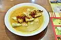Laksan Palembangese Fishcake Dish made from sago and fish. This dish made in an oval shape with almost pempek flavor, but served with coconut milk sauce.