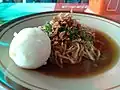 Empal gepuk West Java Meat Beef shank smashed until soft then soaked in coconut milk. It is then fried when made to order.