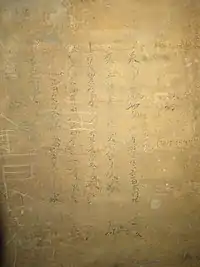 Inscriptions in cursive Jurchen written in ink on the inner wall of the 6th storey of the Ten Thousand Copies of the Huayan Sutra Pagoda (Wànbù Huáyánjīng Tǎ 萬部華嚴經塔).[17]