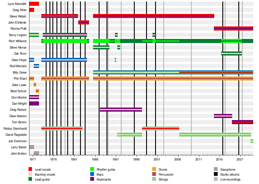 Kansas is an American progressive rock band from Topeka, Kansas. The band's current lineup features constant members Rich Williams (currently as lead guitarist) and Phil Ehart, alongside bassist and vocalist Billy Greer (since 1985, co-lead vocalist since 2006), vocalist and keyboardist Ronnie Platt (since 2014), keyboardist Tom Brislin (since 2018), and violinist and rhythm guitarist Joe Deninzon (since 2023)