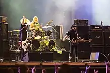 The lineup of Lemmy, Phil Campbell and Mikkey Dee remained constant from 1995 to 2015, the longest in the band's history.[21] During summer 2003, Campbell was substituted at two shows by former Danzig guitarist Todd Youth after his mother had died, before joining him for a third date and performing as a four-piece.[22] In September 2009, former Guns N' Roses and Velvet Revolver drummer Matt Sorum filled in for Dee, who took part in the Swedish TV show Kändisdjungeln.[23] Lemmy later cited a "breakdown in communication" as the reason for Dee's absence, explaining that "Our management didn't know that he'd signed up for this when they booked the tour."[24]