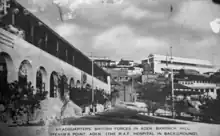 The first hospital for aviation personnel in the British military was at Hampstead in London. This facility opened in 1917 and was open to those from the Royal Flying Corps and the Royal Naval Air Service.[1] Staffing at RAF Hospitals was based on the number of beds and the work that was undertaken at that facility. Some of the larger bases could have a roll of between 4,000 and 10,000 people to cater for. Halton, Cranwell, Matlock, Ely, and Torquay were considered separate entities from any RAF bases. Halton and Cranwell had 20 and 12 medical officers respectively, whereas the large training bases at Cosford and St Athan only had eight each.[2] The original RAF Officers Hospital was opened at Finchley in 1919, moved to Uxbridge in 1925, and then to Torquay in 1940. A third move was precipitated in October 1942 when the hospital at Torquay was bombed incurring 19 fatalities.[3] Most of the hospitals were built in the 1930s or 1940s, to cater either for the RAF Expansion Period, or due to the outbreak of the Second World War.[4]