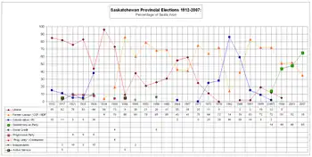 The chart on the upper right shows the information graphically, with the most recent elections on the right. It shows the popularity of the Liberal Party (red) before World War II, and the subsequent rise of the Co-operative Commonwealth Federation – succeeded by the New Democratic Party (orange). The successes and failures by the Conservatives (blue) and the recent arrival of the Saskatchewan Party (green) can also be seen.