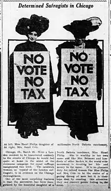 "Determined Suffragists in Chicago" Leavenworth Times, March 24, 1910, Hazel Philip of North Dakota and Janet Cole of South Dakota.