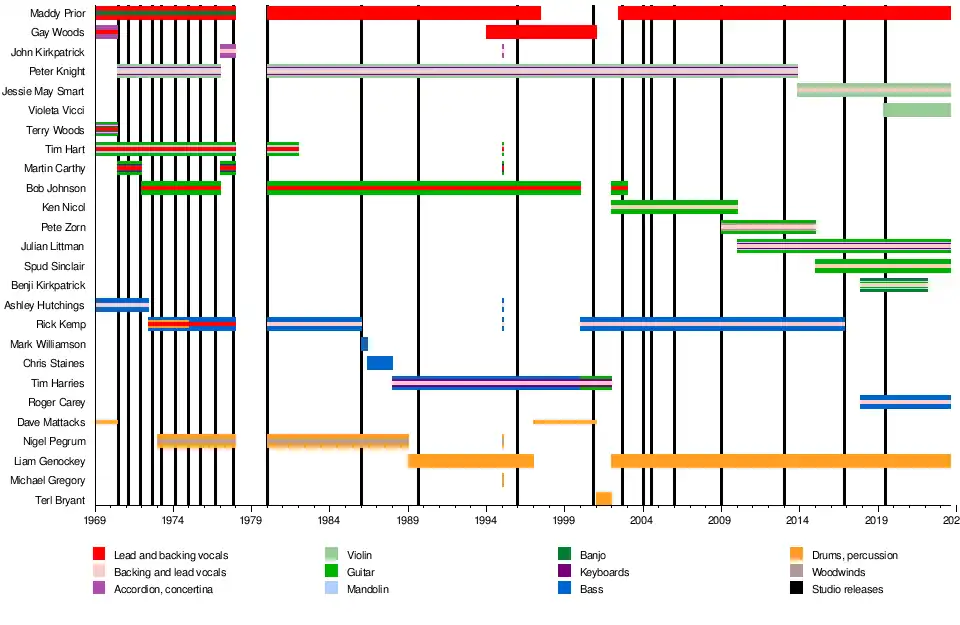 Steeleye Span is a British folk rock band formed by bassist Ashley Hutchings after he left Fairport Convention in 1969, the original line-up also included duo Tim Hart (guitar, mandolin, vocals) and Maddy Prior (vocals) and husband and wife team Terry Woods (guitar, concertina, mandolin, vocals) and Gay Woods (vocals, bodhran, concertina, autoharp).[1] The current line-up includes Prior, along side drummer Liam Genockey (who first joined in 1989), multi-instrumentalist Julian Littman (since 2010), violinist Jessie May Smart (since 2014), guitarist Andrew "Spud" Sinclair (since 2015), bassist Roger Carey (since 2017) and second violinist Violeta Vicci (since 2019)