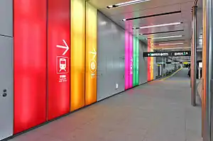 Color-coded wall paneling helps passengers inside the Tokyo Metro Fukutoshin Line’s Shibuya Station to navigate passages to connecting rail lines. Shibuya is the fourth busiest station on the Tokyo Metro network and a major interchange with Tōkyū, Keiō, and JR East trains.