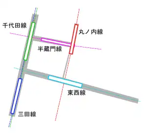 Ōtemachi is one of the most important interchanges on the Tokyo Metro network, connecting four Tokyo Metro lines and one Toei Subway line. Ōtemachi Station is also connected by underground passages to an extensive station complex comprising Tōkyō Station, Nijūbashimae Station, Hibiya Station, Yūrakuchō Station, Ginza Station, and Higashi-Ginza Station.