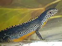 Salamandridae, or true salamanders, are a family of terrestrial and aquatic salamanders, mostly distributed in Asia and Europe, although some species are found in North Africa and North America. Most species have slightly toxic skin secretions and many develop dorsal body and tail fins when they return to an aquatic stage. There are 109 species in 21 genera; of them, five species in four genera are found in Poland.[2]