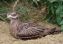 The thick-knees are a group of largely tropical waders in the family Burhinidae. They are found worldwide within the tropical zone, with some species also breeding in temperate Europe and Australia. They are medium to large waders with strong black or yellow-black bills, large yellow eyes and cryptic plumage. Despite being classed as waders, most species have a preference for arid or semi-arid habitats.