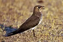 Glareolidae is a family of wading birds comprising the pratincoles, which have short legs, long pointed wings and long forked tails, and the coursers, which have long legs, short wings and long, pointed bills which curve downwards.