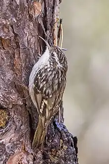 Treecreepers are small woodland birds, brown above and white below. They have thin pointed down-curved bills, which they use to extricate insects from bark. They have stiff tail feathers, like woodpeckers, which they use to support themselves on vertical trees.