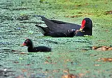 Rallidae is a large family of small to medium-sized birds which includes the rails, crakes, coots and gallinules. Typically they inhabit dense vegetation in damp environments near lakes, swamps or rivers. In general they are shy and secretive birds, making them difficult to observe. Most species have strong legs and long toes which are well adapted to soft uneven surfaces. They tend to have short, rounded wings and to be weak fliers.