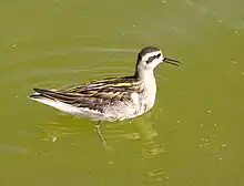 Red-necked phalarope, large numbers occur at sea.