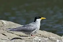 Laridae is a family of medium to large seabirds, the gulls, terns, and skimmers. Gulls are typically grey or white, often with black markings on the head or wings. They have stout, longish bills and webbed feet. Terns are a group of generally medium to large seabirds typically with grey or white plumage, often with black markings on the head. Most terns hunt fish by diving but some pick insects off the surface of fresh water. Terns are generally long-lived birds, with several species known to live in excess of 30 years.