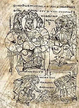 Burning of Arian books at Nicaea (illustration from a compendium of canon law, ca. 825, MS. in the Capitular Library, Vercelli)