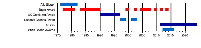 The following is a timeline of notable U.S. comics awards that feature multiple categories. Awards voted on by professionals are in shades of blue; fan awards are in shades of red. (The Ignatz Award is a mixture, as the nominees are selected by professionals, but the winners are determined by the attendees of that year's Small Press Expo.)