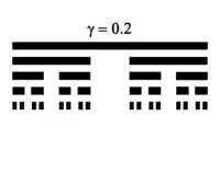 Solution of 1.6402Attractor of IFS with 3 similarities of ratios 1/3, 1/2 and 2/3Generalization : Providing the open set condition holds, the attractor of an iterated function system consisting of similarities of ratios , has Hausdorff dimension , solution of the equation coinciding with the iteration function of the Euclidean contraction factor: .[5]