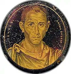 This is a list of surviving ancient Roman gold glass portraits of the finer painted sort. The majority of surviving Roman gold glass pieces are the cut-off bottoms of drinking glasses made with unpainted gold leaf. These sometimes bear the names of individuals and were probably commemorative gifts on a special occasion such as a wedding anniversary or winning a contest. Achieving a good likeness was probably not an aim, and certainly not an achievement of this class of object, and they are not included here. The objects here belong to a smaller class of finely painted portrait miniatures, although a few seem also to have been originally placed in cups. Following a table summarizing the basic information, individual portraits are discussed in separate sections.