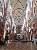 The nave is the central approach to the high altar, the main body of the church, in Romanesque and Gothic Christian abbey, cathedral basilica and church architecture. "Nave" (Medieval Latin navis, "ship") was probably suggested by the keel shape of its vaulting.[1] The nave of a church, whether Romanesque, Gothic or Classical, extends from the entry (which may have a separate vestibule, the narthex) to the chancel and is flanked by lower aisles[2] separated from the nave by an arcade.