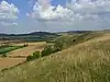 The table is colour-coded based on the classification or "listing" of the hill. The types that occur in Wiltshire are Marilyns, HuMPs and TuMPs, listings based on topographical prominence. "Prominence" correlates strongly with the subjective significance of a summit. Peaks with low prominences are either subsidiary tops of a higher summit or relatively insignificant independent summits. Peaks with high prominences tend to be the highest points around and likely to have extraordinary views. A Marilyn is a hill with a prominence of at least 150 metres or about 500 feet.[1] A "HuMP" (the acronym comes from "Hundred Metre Prominence) is a hill with a prominence of at least 100 but less than 150 metres.[2] In this table Marilyns are in beige and HuMPs in lilac. The term "sub-Marilyn" or "sub-HuMP" is used, e.g. in the online Database of British and Irish Hills to indicate hills that fall just below the threshold. To qualify for inclusion, hills must either be 200 metres or higher with a prominence of at least 30 metres, below 200 metres with a prominence of at least 90 metres (the threshold for a sub-HuMP) or be in some other way notable. In this context, a "TuMP" is a hill with a prominence of at least 30 but less than 100 metres; by way of contrast, see also the article listing Tumps (a traditional term meaning a hillock, mound, barrow or tumulus). For further information see the Lists of mountains and hills in the British Isles and the individual articles on Marilyns, HuMPs and TuMPs.