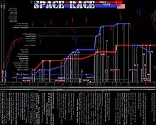 A chart showing relative accomplishments in human spaceflights (along with probes) visually graphing how the U.S. had far surpassed the Soviet Union in the 1970s with lunar missions, yet lagged years behind in space station activity.
