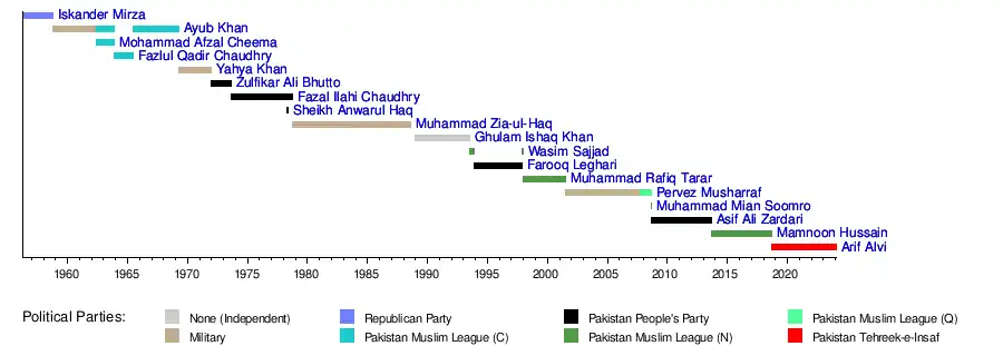There have been a total of 13 presidents. The first president was Iskander Ali Mirza who entered office on 23 March 1956. The current office holder is Arif Alvi, who took charge on 9 September 2018, following his victory in the 2018 elections.[1]