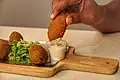 Arabian Peninsula | A deep-fried ball or patty-shaped fritter of Arab origin, featuring in Middle Eastern cuisine, particularly Egyptian and Levantine cuisines, and made from broad beans, ground chickpeas, or both. |