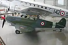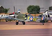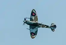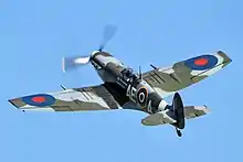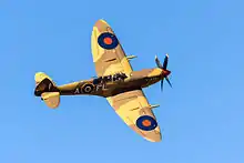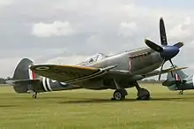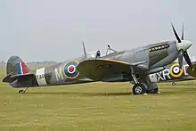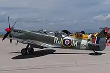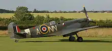 • Spitfire Tr.9 MJ772 (G-AVAV). Served with 341 Squadron, Royal Air Force as NL-W then with 340 Squadron as GW-A. Sold to Vickers-Armstrongs in 1950, converted to two-seat trainer. Carried Class B markings G-15-172. To Irish Air Corps in May 1951 as IAC 159. Withdrawn from flying in 1960. Sold to Film Aviation Services in November 1963 and stored at Biggin Hill. Sold to COGEA, Belgium in May 1964 and stored at Ostend Airport. Sold to Tony Samuelson in 1965 and registered G-AVAV in November 1966. Restored to airworthy condition in July 1967. Leased to Spitfire Productions Ltd for use in the film Battle of Britain. A forced landing was made at Little Staughton on 9 July 1968 due to engine failure, and subsequently returned to flying condition. Later sold to Sir William Roberts and displayed as part of the Strathallan Collection, coded NL-R. Sold to Doug Champlin of Enid, Arizona, registered N8R. Later registered in Germany as D-FMKN.[86] Suffered off-airport landing in field, near Woodchurch, Kent, United Kingdom, on 7 September 2015. Pilot uninjured.[87][88] As of March 2019, airworthy owned by Warbird Experiences Ltd, based at Biggin Hill airfield.[89] In August 2021, MJ772 was flown to its new home in The Netherlands with the Flying Vintage Everyday Foundation.[90]