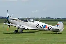 • Spitfire LF Mk IXc MK732 (PH-OUQ). Operated by The Historic Flight of the Royal Netherlands Air Force (Koninklijke Luchtmacht Historische Vlucht) and based at Gilze-Rijen. Built in 1943, it saw action during D-Day. Following the restoration to flight, it initially carried the air force (Klu) markings H-25. Following this it was painted in the scheme it wore when serving with No. 485 Squadron RNZAF as OU-U, named 'Baby Bea V', but now wears an all-over silver scheme 3W-17 of the Royal Netherlands Air Force.[91]