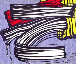 Lichtenstein presents work that resembled the abstract expressionism that the contemporaneous viewing audience had become accustomed to seeing, however, his result is completely flat, without any trace of the brushstroke or the artist's hand. Meanwhile, the work references mechanical printing with the Ben-Day dots background, which enables Lichtenstein to parody his predecessors and make a "powerful abstract composition".[9] Although Abstract Expressionists in general considered their style as opposing popular culture, Lichtenstein's juxtaposition of the Brushstrokes against the mechanical process links the style to popular culture and results in a statement of the importance of mass media in the promotion of the style.[2]