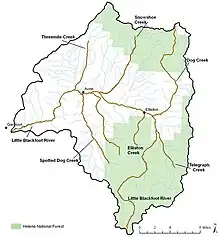 The Little Blackfoot River is located in Powell County, Montana.[2] The river is 48-mile (77 km) long,[3] and its watershed covers 413 square miles (1,070 km2).[4] Its name refers to the Piegan Blackfeet tribe, which frequently visited the area. The first mention of the name was an 1831 entry in a diary kept by John Work, trader for the Hudson's Bay Company. Work implies that the name did not originate with him, but with American fur trappers who had been using the area extensively to hunt beaver for the previous two decades.[5]