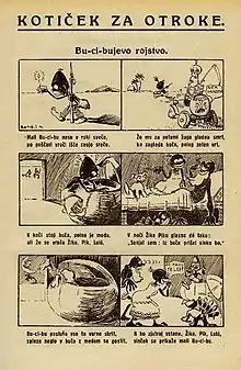 Little Negro Bu-ci-bu (Slovene: Zamorček Bu-ci-bu),[1] also mentioned as Buci-Bu,[2] was the first Slovene comic strip.[3] It was created by Milko Bambič and published in 1927 in the children's column of the monthly Naš glas (Our Voice) in Trieste.[4] It is a story about an arrogant and tyrannic black king that with his false wisdom leads his people to ruin[5] and commits suicide.[6] It caused a controversy, because it was seen as a parody on the Italian leader Mussolini,[6] and the author predicted his demise.[3] The Italian Fascist authorities forbade Bambič's works.[6] He escaped from Trieste to Yugoslavia to avoid arrest.[4]