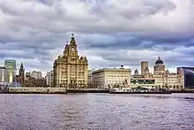 Liverpool city centre skyline as seen from the River Mersey featuring Prince's Dock on the left, Pier Head, Mann Island Buildings and Museum of Liverpool in the centre and part of the Royal Albert Dock in the far right