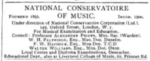 National Conservatoire of Music, Ltd. Inst. 1895, incor. 1900. London Office and Educational Department, 149, Oxford Street. Council: Professor Alexander Phipps, Warden; Dr W.H. Paltridge; Dr F.W. Haydock. [...] Branches: Liverpool College of Music, 44 Princes Rd; & Manchester.