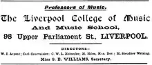 The College appeared to change name and location numerous times. Although some records refer to 'since 1884' and others to 'established in 1895', there is a report of the 'new Music School, Liverpool (limited)' opening on 21 January 1892,[4] and also a tenth-anniversary concert (for the College) on 10 November 1902.[5] The decision to change from 'School' to 'College' was taken around May 1896.[6]