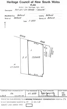 • 23/3/1984: Permanent Conservation Order over "Llanarth" gazetted for Part Lot 1 in DP 150460.[77] Heritage Office (2008B) records show that the property was subdivided by Bathurst City Council whilst the Minister was considering the PCO, therefore the PCO was gazetted for Part Lot 1 in DP 150460 instead of Lot 3 in DP 710184.