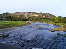 Llanelwedd quarries from the bridge across the River Wye