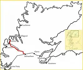 A scheme for a railway to run between Achnasheen and Aultbea was first proposed in early 1889 by landowners in the Gairloch and Loch Ewe area.[4] The main proposers were: Sir Kenneth Mackenzie of Gairloch; the 2nd Earl of Lovelace; Duncan Darroch of Gourock and Torridon; Paul Liot Bankes of Letterewe; and John Dixon of Inveran. Dixon was the principal driver in the campaign to attract support and funding. Between 1890 and 1892, he composed dozens of letters, memoranda and pamphlets, and sent them to the Scottish Office, MPs and Cabinet Ministers in London; and he organised or encouraged public meetings in the Gairloch area and on the Isle of Lewis.[5] As well as stressing the advantages for fisheries and passenger-traffic, the campaign flagged up the potential for increased tourist-traffic to the area. Many of the arguments put forward were deliberately phrased to show that the Aultbea proposal was far better than the rival Garve to Ullapool railway which, in August 1890, had already received Parliamentary approval.