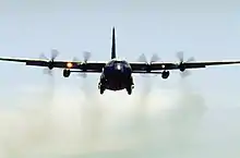 In the years after the end of the Vietnam War, the Hercules continued to take part in military exercises and support overseas peacekeeping commitments. They also became well known in the Southern Pacific after being called on for relief following natural disasters, including tsunami in New Guinea, cyclones in the Solomon Islands and Tonga, and fires and floods in Australia.[73] The Hercules played a significant part in the evacuation of civilians following Cyclone Tracy in 1974–75; a No. 37 Squadron C-130E was the first aircraft to touch down in Darwin following the disaster.[59] Eight of No. 36 Squadron's aircraft were involved in the relief effort, flying over 550 hours, and carrying 2,864 passengers and almost 800,000 lbs of cargo; No. 37 Squadron contributed 11 aircraft, flying 700 hours, and carrying 4,400 passengers and 1,300,000 lbs of cargo.[74] On 19 January 1978 a C-130E returning to Australia from Butterworth was used to intercept a drug-smuggling aircraft near Darwin; the smuggler eventually landed at Katherine, and was arrested.[75] After clocking up 147,000 accident-free flying hours over the course of 20 years, No. 36 Squadron's C-130As were replaced in 1978 by C-130H models.[8][25] The C-130Hs were primarily used as tactical air lifters throughout their service with the RAAF, and worked closely with the Army's special forces units.[20]