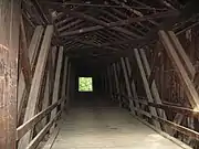 In August 1868, a contract was awarded by the Linn County Commissioners to Bishop & Eaton for a bridge across Locust Creek, with the cost not to exceed 5,500 dollars.[6] The structure is a Howe truss, constructed of white pine. Vertical iron rods tightly secure diagonal wooden beams to the bottom and top of the structure.[4] In addition to its utilitarian function, over time the bridge was a hangout for locals with some proclaiming their love for one another and their presence at the bridge with carvings along the bridge's internal walls. As a popular fishing and swimming spot, the bridge was visited by John J. Pershing; his boyhood home and the state park bearing his name are nearby.[4]