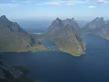 The national park extends approximately 36 km as the crow flies from the islets at the northern end of the island of Moskenesøy to the islands off the southwest coast.[5] The protected area consists mainly of a mountain range with rugged peaks off the rugged west coast of the island, except for the southern part of Moskenes, which is part of the national park. The national park comprises the southern part of the 160 km long mountain range, called Lofotenveggen (translated from Norwegian as "Lofoten Wall").[6][7]