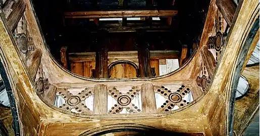The earliest existing historical records of the church date back to the year 1325, but the church was not new that year. The wooden stave church was established during the late 12th century. Through 20th-century dendrochronological dating the logs of the church were dated to the year 1192, so the church must have been built around that time. Originally, the church was named "Hvams kirke". The church has a rectangular nave, a narrower and lower chancel, and a small sacristy on the south side of the chancel. The church is supported by four columns, and has three lavishly carved portals, chancel-arches, and column capitals.[3][4][5]