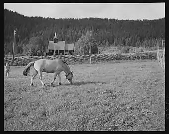 The church was rebuilt and enlarged in 1749. The old choir was torn down and replaced with a wider choir. The old open-air corridors that used to surround the nave were incorporated into the nave. The west wall of the nave was moved about 2.7 metres (8 ft 10 in) further west to lengthen the old nave. A new tower was built on top of the roof of the nave as well. After this project, only some of the wall and roof timbers remained from the original stave church.[4][5]