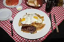 Lomo a lo pobre, bistec a lo pobre, or bife a lo pobre is a dish from Peru and Chile. The ingredients are beef tenderloin (Spanish: lomo) topped with one or more fried eggs and French fries.[1][2] Unlike steak and eggs, lomo a lo pobre is eaten as a lunch or dinner.
