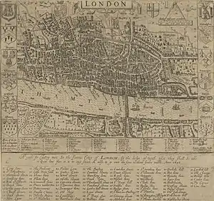 Map of London in 1593. There is only one bridge across the Thames, but parts of Southwark on the south bank of the river have been developed.