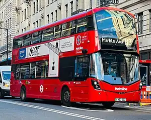 After 70 years of operation between Edgware and Oxford Circus, the route was withdrawn between Oxford Circus and Orchard Street, and diverted to Marble Arch (returning from Portman Street) on 7 November 2009 as part of the Mayor of London's pledge to reduce the number of buses using Oxford Street,[2] breaking some 2,100 daily passenger journeys on the route between Oxford Street, Hendon, Mill Hill and Edgware. The route was also planned for simultaneous conversion to 24-hour operation in 2009, along with improvements to evening and Sunday frequencies, and a possible diversion in Mill Hill via The Broadway, Hale Lane and Selvage Lane.[3]