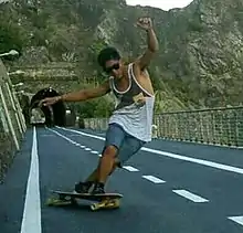 The first longboards were made by Preston Nichols in the 1940s and 50s[1] as an alternative to surfing when the waves were too dull. Early skaters built dangerous, improvised boards out of planks of wood and roller skates.[2] Manufactured longboards first became commercially available in 1959 when Makaha, Jack's, and Hobie became the first professional longboard distributors.[3] These early longboards were still relatively crude, as they still featured metal wheels, but later had clay wheels due to improved safety factors. Longboarding became a popular activity in the late 1950s and early 1960s, but its popularity had largely died by 1965. Longboarding made a comeback in 1972 when Frank Nasworthy and the Cadillac Wheel Company introduced the urethane longboard wheel.[4] Urethane wheels allowed skaters to reach very high downhill speeds which were not possible before. The introduction of reverse kingpins (RKP) also improved stability for riders. The exact inventor of reverse kingpins is unknown, however both Randal and Variflex had reverse kingpin trucks advertised and featured in Skateboarder magazine in 1979.[5] The reverse kingpin truck improved stability and suppleness which helped downhill longboarding grow into a legitimate sport, with the International Gravity Sports Association (IGSA) as its governing body.[6] The 90's also saw the introduction of the cutout deck, which has sections cut out around the wheels to prevent the wheels from touching the board during hard turns. Longboard technology has evolved rapidly to accommodate unique modern skating disciplines including downhill, slalom, freeriding, dancing, and freestyle. Modern longboard decks can be made from a variety of materials including fiberglass composites, aluminum, and carbon fiber. Precision trucks, which are machined with cutting edge CNC technology instead of die casting with molds, offer more strength and maneuverability than cast trucks and have achieved popularity among professional skaters.[7]